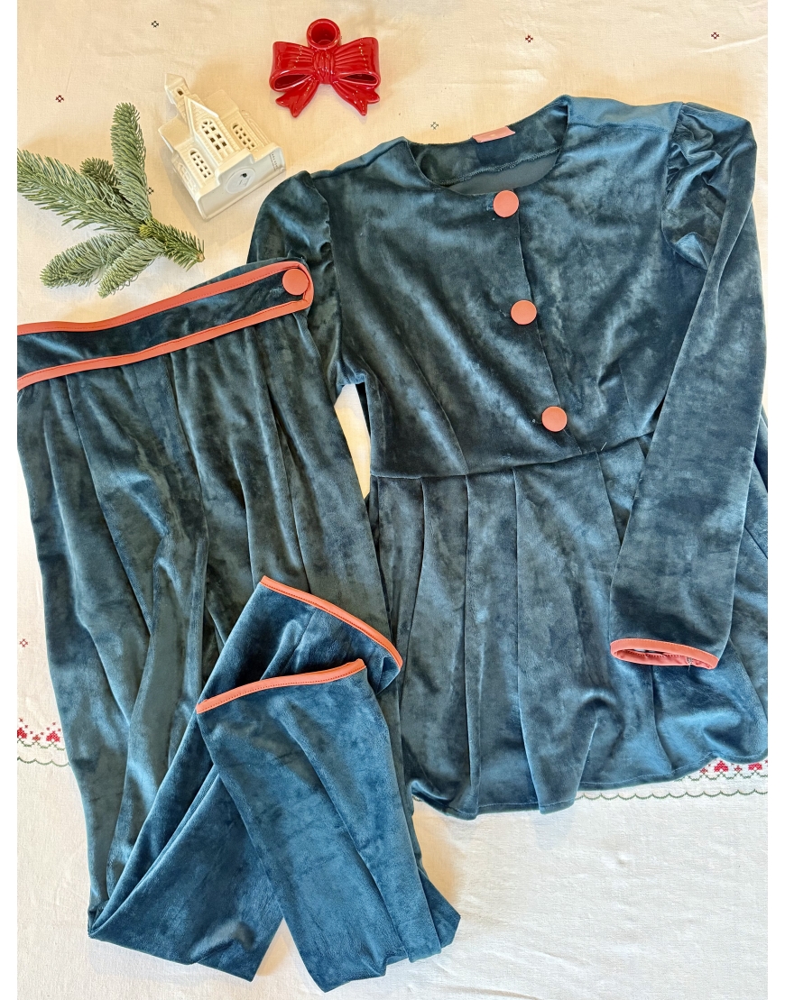 Calças e blusa em veludo verde, com botões forrados em licra.